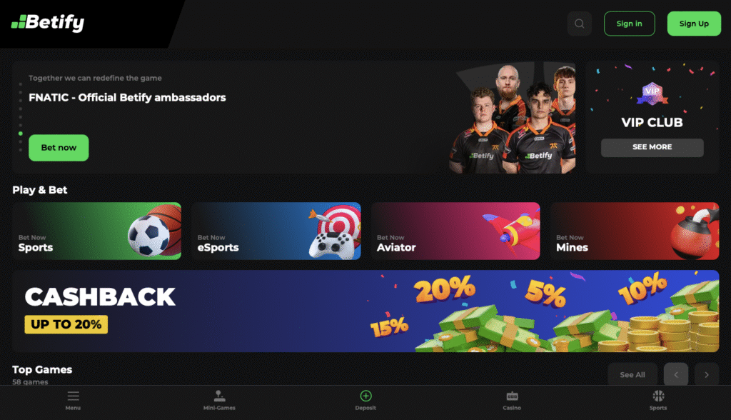 Betify hat ein VIP-Programm mit 18 Levels. Cashback steigt von 1% (Level 1) bis 20% (Level 18). Auszahlungslimits wachsen mit.