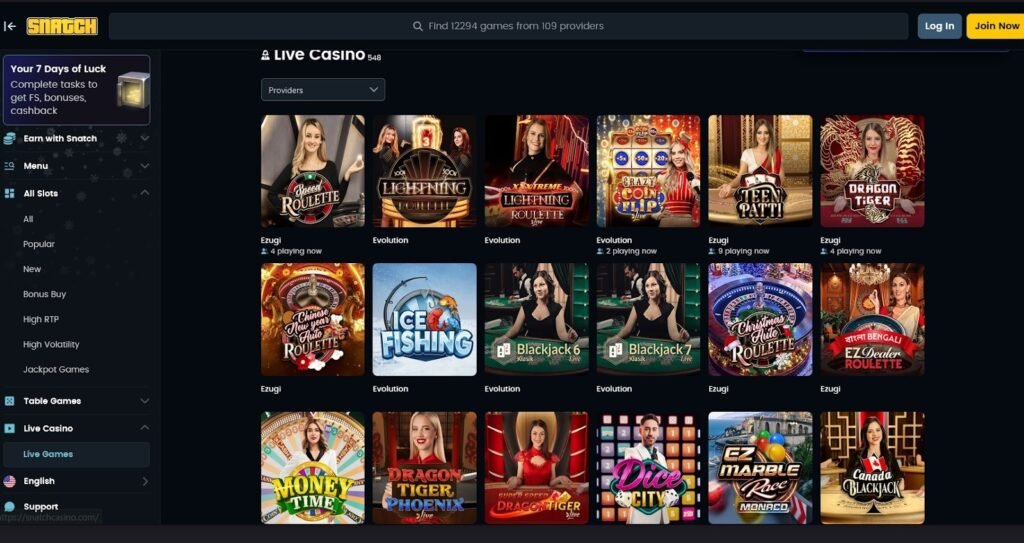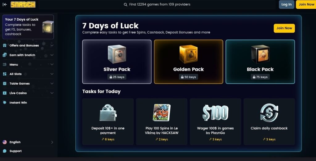 Casino Snatch liefert bei Design, Spielangebot und Bonusstruktur auf einem klar überdurchschnittlichen Niveau. 8.000+ Spiele von 90+ Studios, Evolution Gaming im Live Casino, vier Willkommensboni über vier Einzahlungen, wöchentlicher Cashback bereits ab VIP-Level 1 — das ist ein vollständiges Paket.