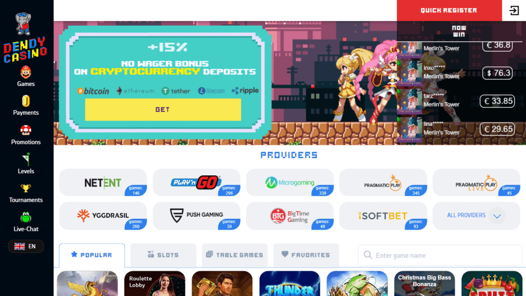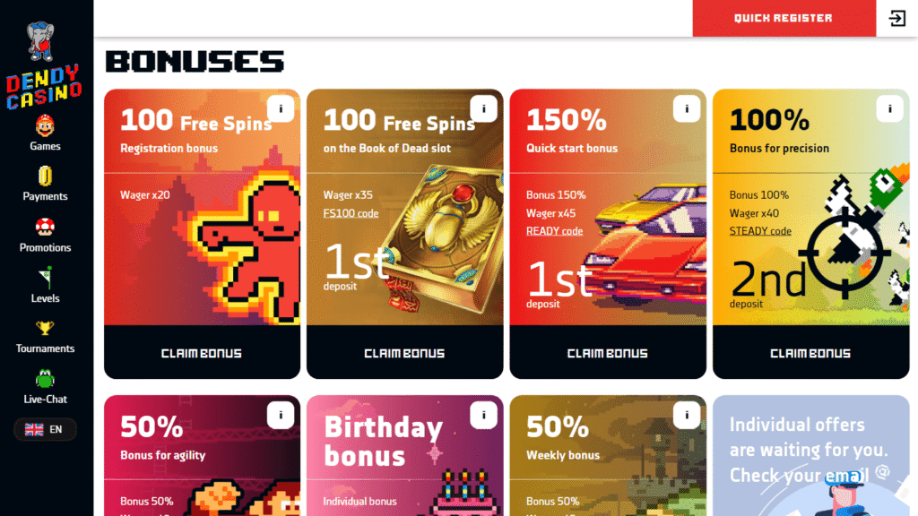 Dendy Casino bietet neuen Spielern nach der Registrierung 100 Freispiele ohne Einzahlung. Das ist ein echter Vorteil für Spieler, die einen Anbieter zunächst ohne finanzielle Bindung kennenlernen wollen.