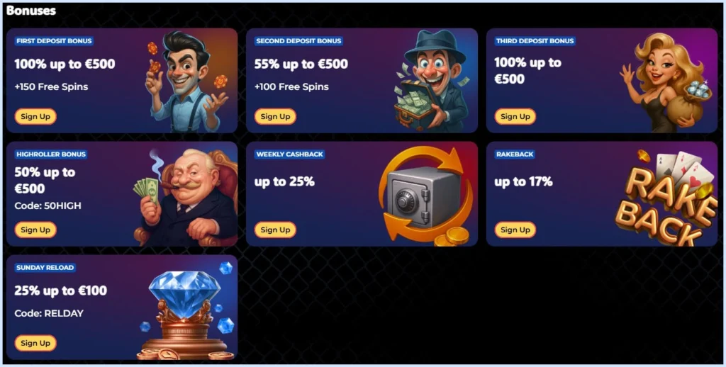 Im Gangstasinos Casino stehen zahlreiche Bonusangebote bereit. Von Willkommensboni über Cashback bis hin zu regelmäßigen Promotionen profitieren Mitglieder fortlaufend von besonderen Vorteilen. Besonders beliebt ist der wöchentliche Cashback, der abhängig vom Aktivitätslevel bis zu 20 % erreichen kann – eine sinnvolle Möglichkeit, eigene Verluste teilweise zurückzuerhalten.
