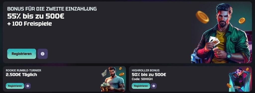 Der Willkommensbonus erstreckt sich über die ersten drei Einzahlungen und bringt insgesamt bis zu 2.500€ plus 250 Freispiele auf euer Konto. Das ist mehr als genug, um die massive Spielesammlung ordentlich zu erkunden.
