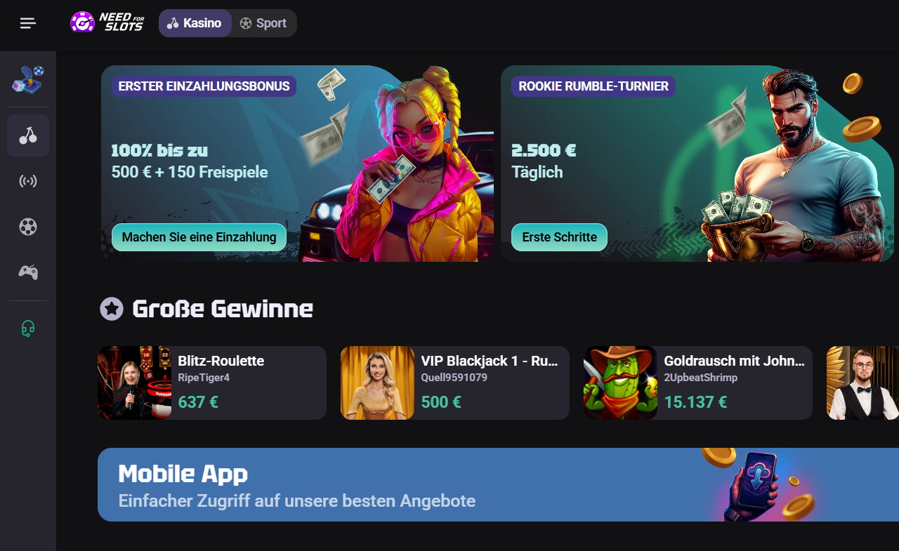 Need for Slots positioniert sich als Casino der neuen Generation, das auf jahrelanger Spielerfahrung der Gründer basiert. Die Plattform wurde von echten Casino-Enthusiasten entwickelt, die genau wissen, was Spieler wirklich brauchen, keine Laborratten-Experimente, sondern bewährte Qualität.