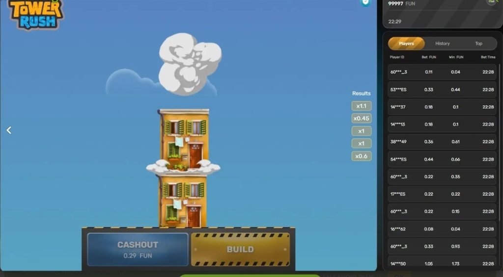 Tower Rush vereint Geschick, Risiko und Nervenkitzel in einem spannenden Mini-Casino-Spiel von Galaxsys. Das Ziel: eine möglichst hohe Turmstruktur bauen – und im richtigen Moment auszahlen, bevor alles einstürzt.