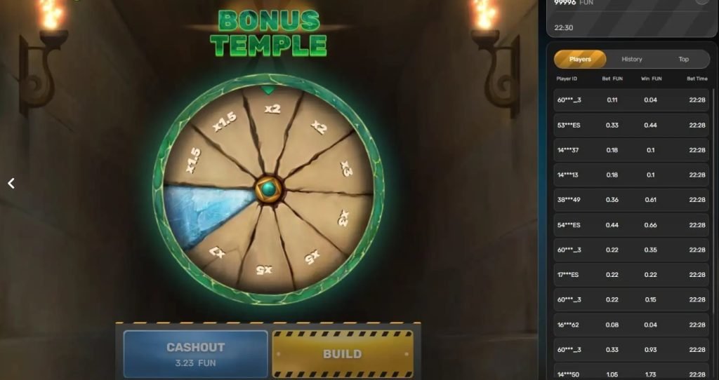 Der Bonus „Frozen Floor“ blockiert beispielsweise für einige Runden die Absturzgefahr, sodass risikolos weitergebaut werden kann. Der „Temple Floor“ hingegen aktiviert eine spezielle Glücksrad-Funktion. Dieses Rad besteht aus zehn Sektoren und garantiert – sobald es ausgelöst wird – drei stockwerksichere Spielzüge mit zusätzlichen Gewinnen.